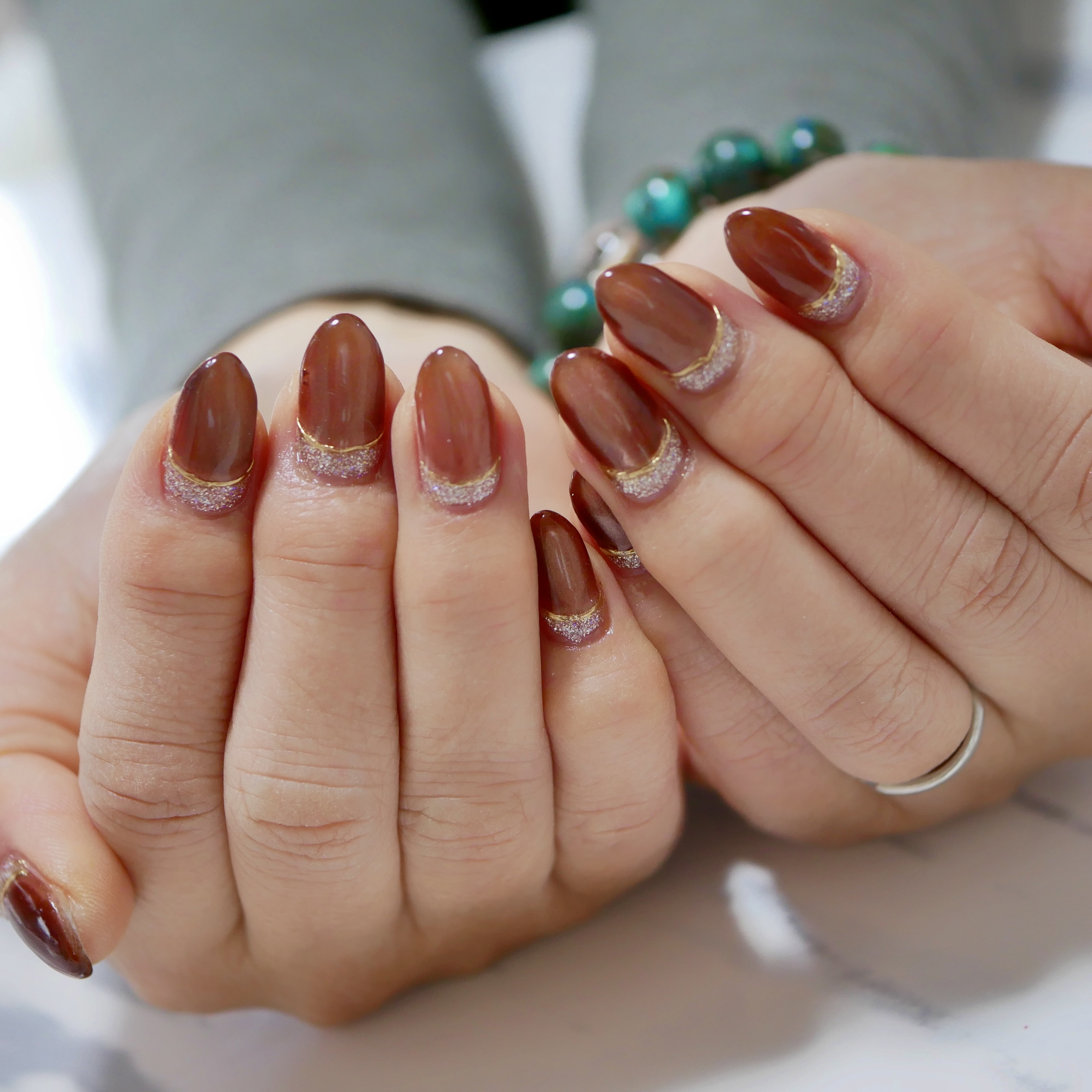 ゴールドとボルドーのマグネットにラメとフラッシュで