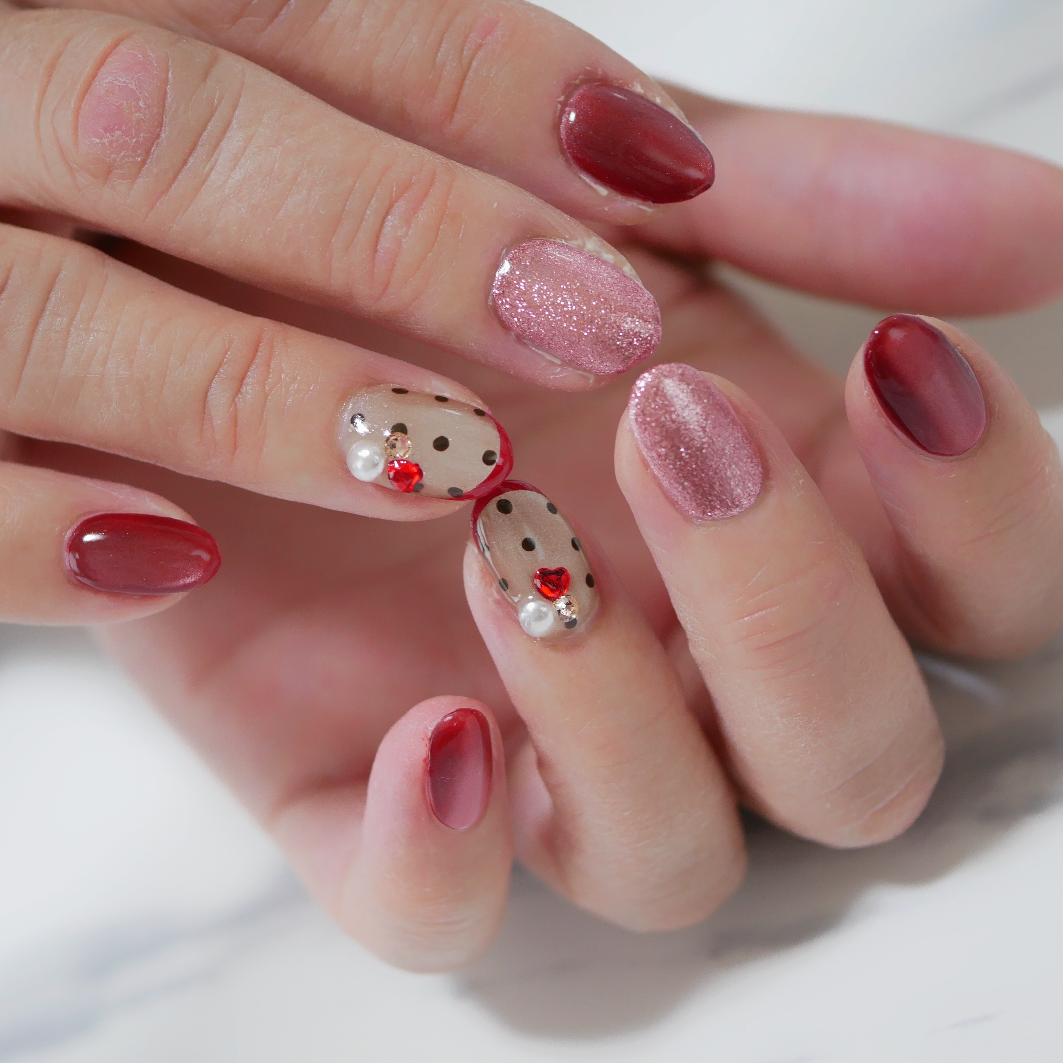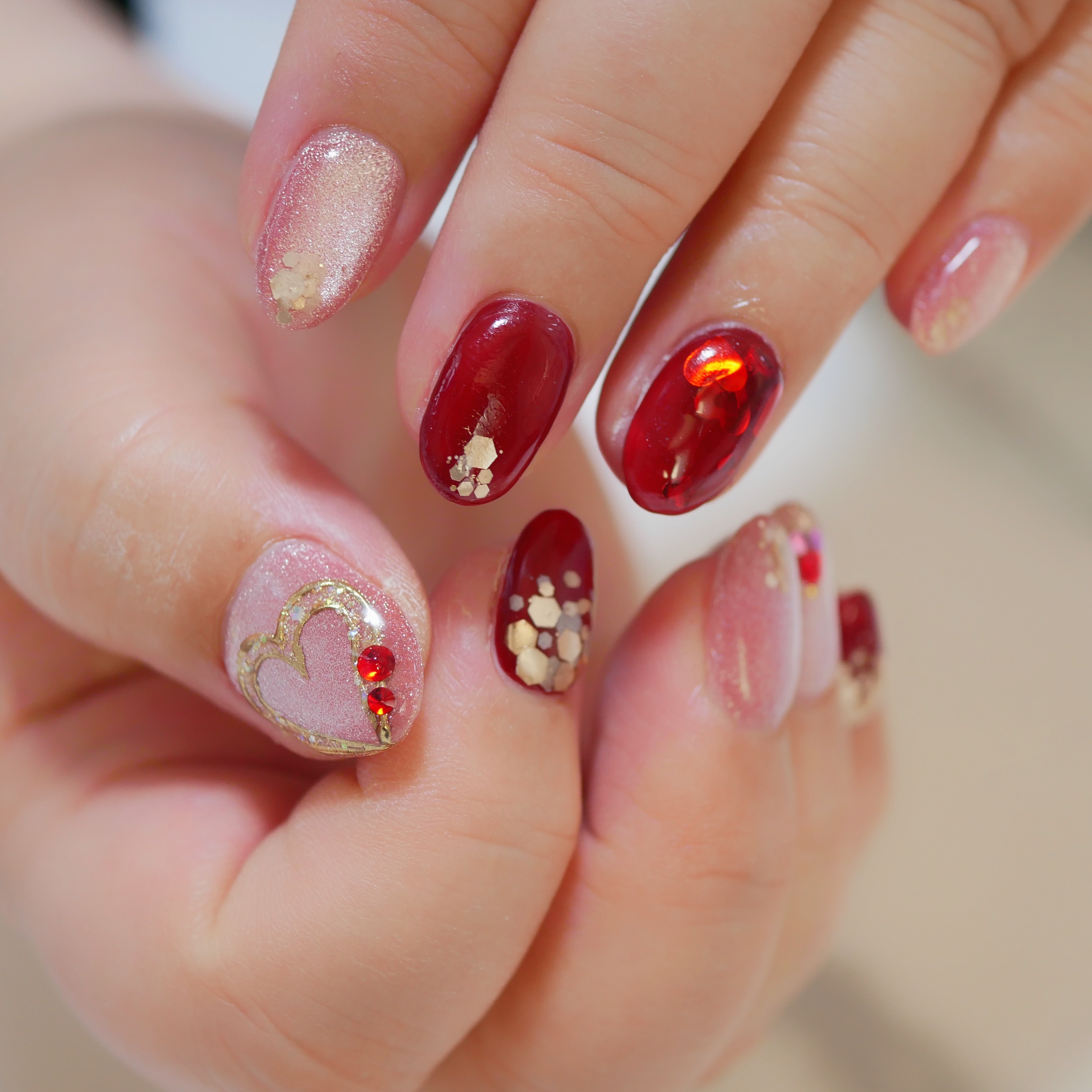ハートのストーンと赤を効かせて気持ちバレンタインネイルです♡