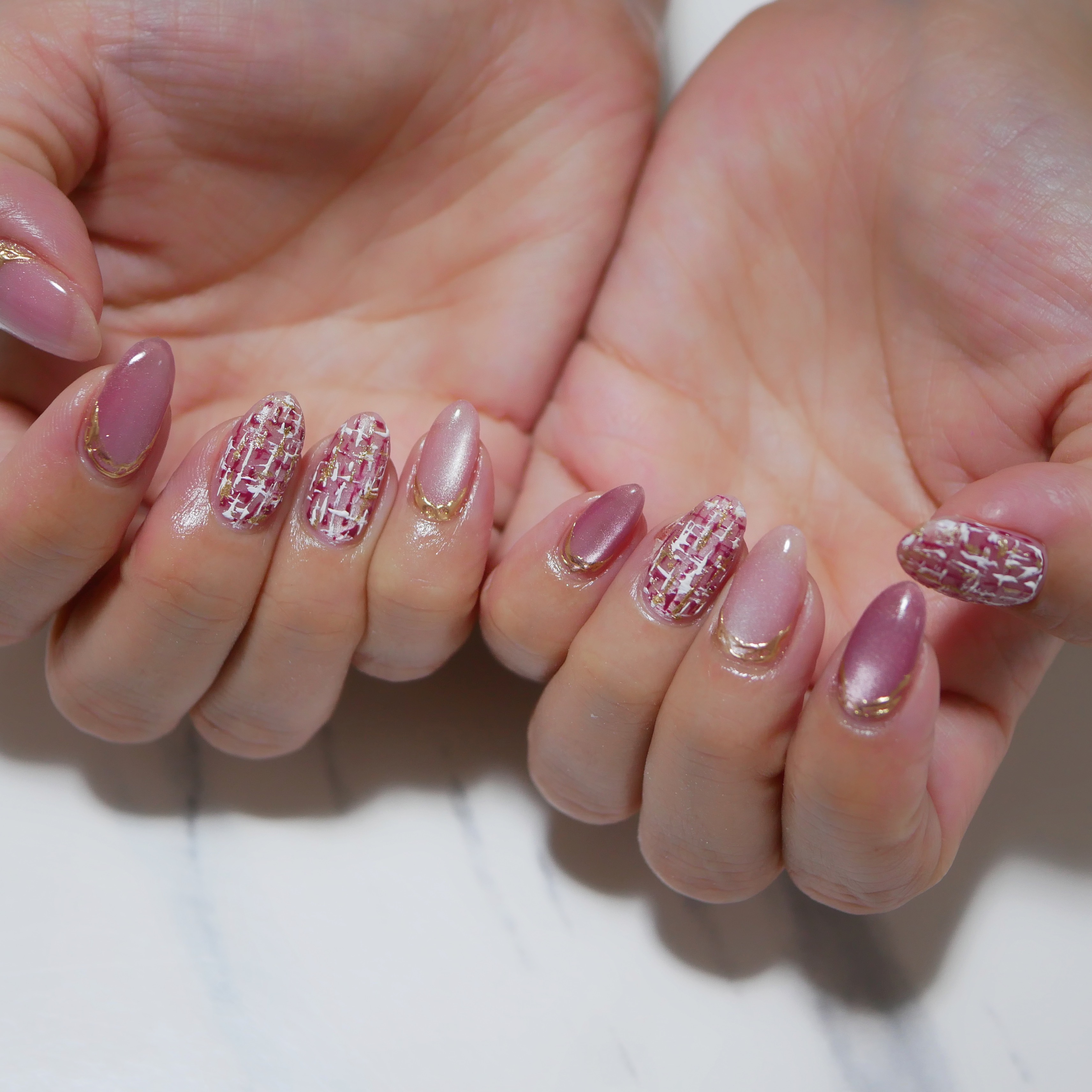 ピンク系で冬にピッタリなツィードネイルにされました
